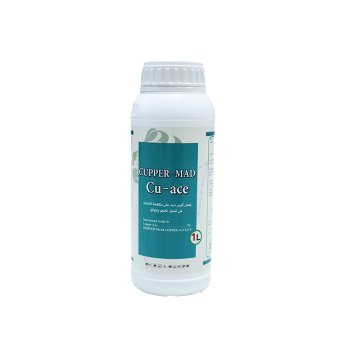 سماد انتقالى (جهازى)يحقق للنبات الاستفادة السريعة و بكفاءة العالية لمعالجة نقص عنصر النحاس يعمل على مكافحة الاشنات فى الموالح والمانجو و يساهم فى مكافحة البياض الزغبي و الندوة المتأخرة و اعفان الجذور الاستخدام 500سم /100لتر 1.5 لتر فى حالة الحقن بنظام الري ب التنقيط و يحتوى على المادة الفعالة اسيتات النحاس 7%